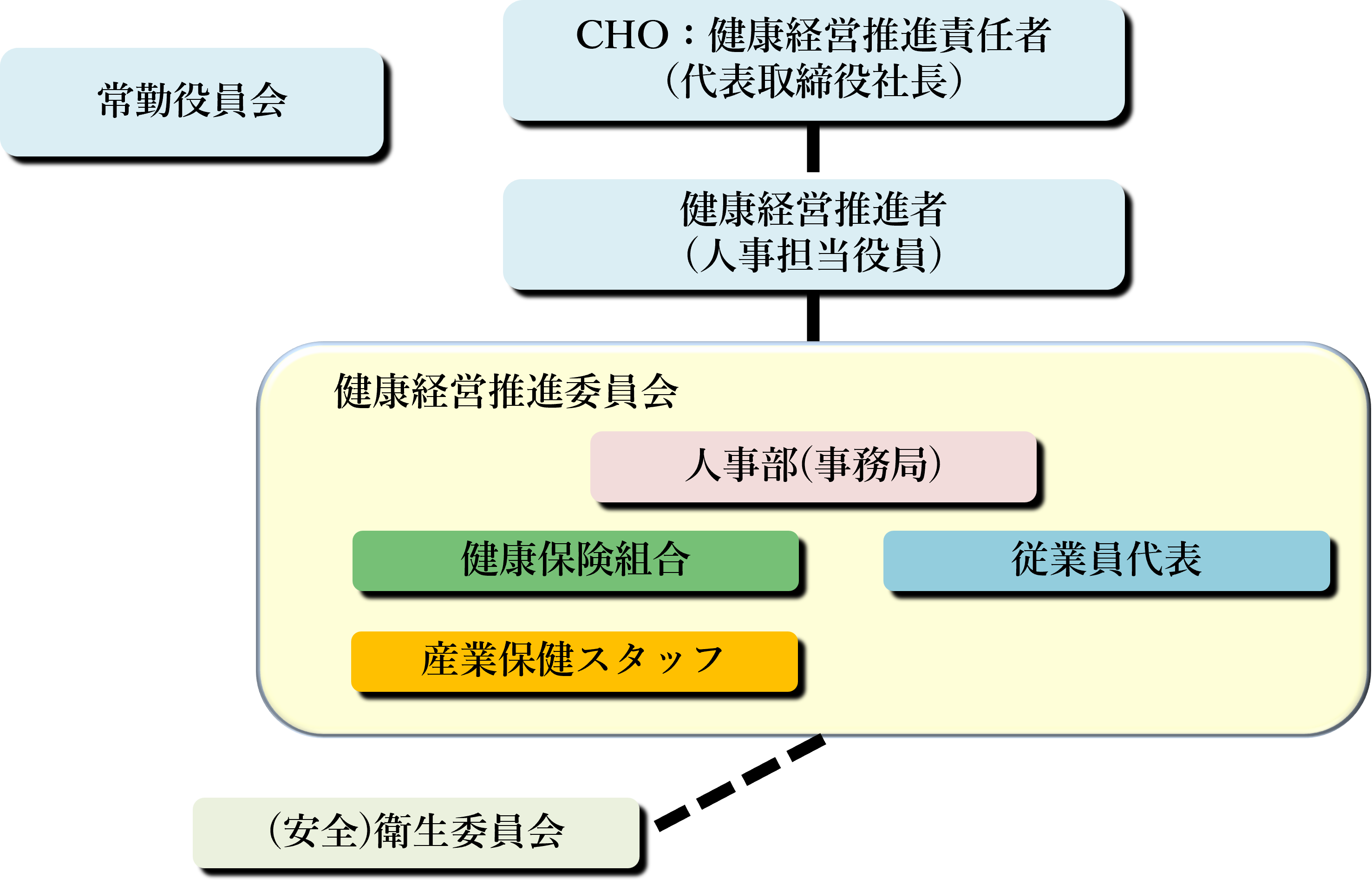 健康経営推進責任者(代表取締役社長)のもと、従業員の健康保持増進に向けて、以下の体制にて健康経営を推進します。